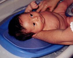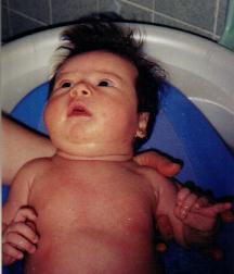 ¡Solo cuando me bañan se me aplaca un poco mi cabello! ¡Aquí se me ve un poquitín revuelto antes de que me lo mojen mis papitos! ¡Ahora ya pataleo en el agua y me gusta mucho! Cuando mi papito alcanza a ayudar a bañarme, él tiene que limpiar el baño mientras mi mamita me seca y me viste. |